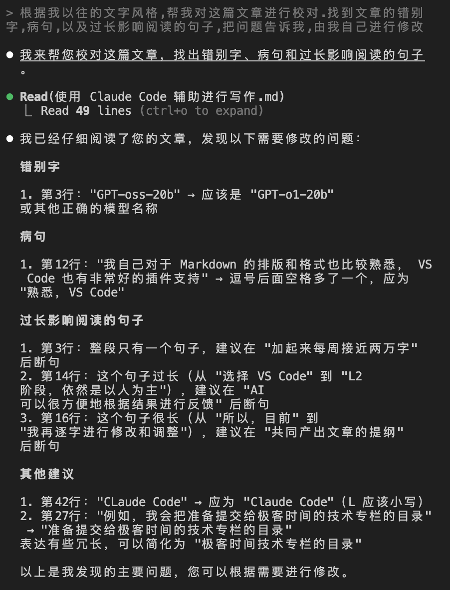 内容校对就是 AI 最擅长的部分了,由于在 CLAUDE.md 和 feature.md 中都已经对相关背景信息做了描述,所以让 Claude Code 去完成类似于找错别字、找病句、找长句等任务,它都完成的很好。为了保证文章的手工感,我一般是让它来找到问题,最终的修改还是我自己完成的。