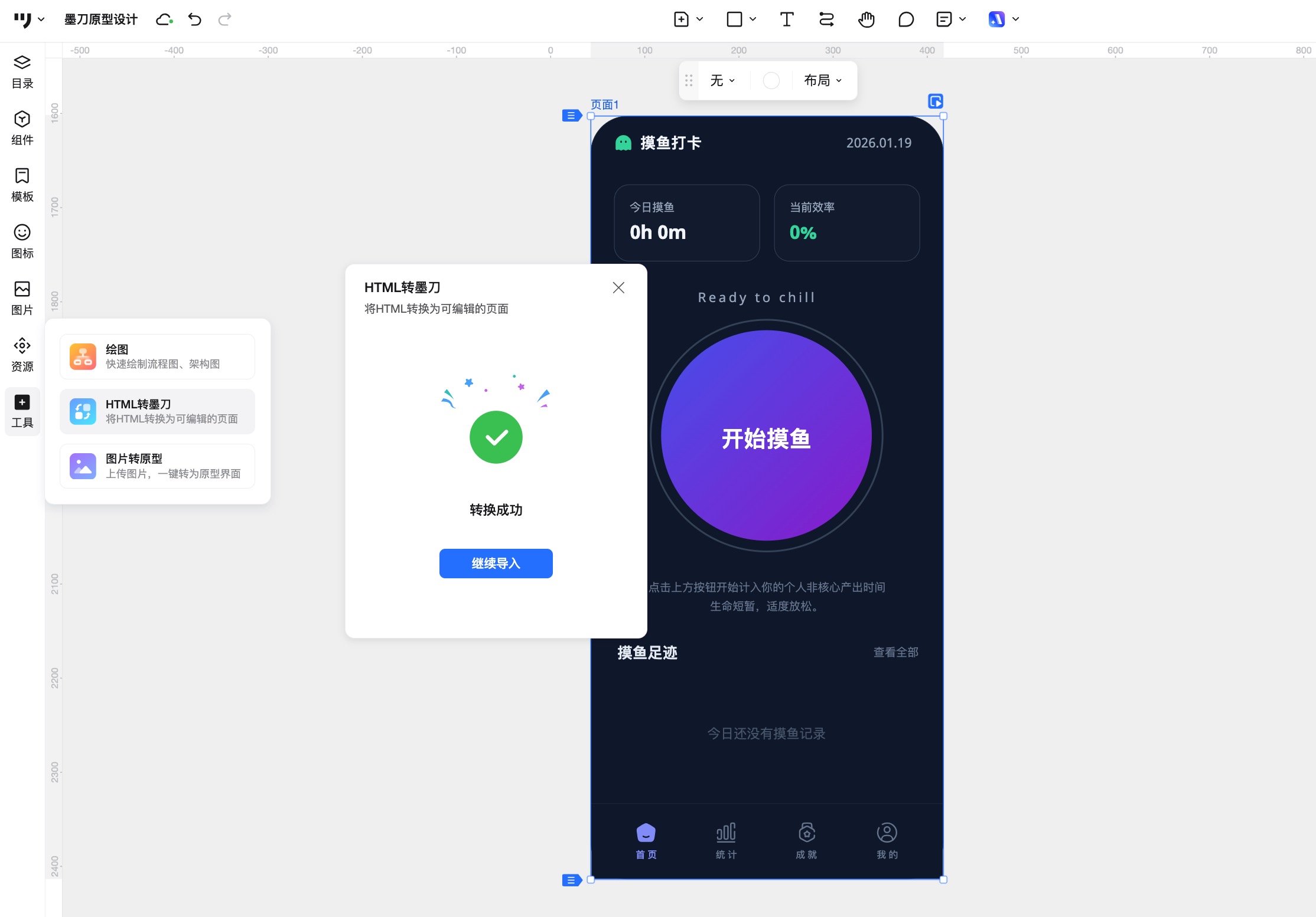 比如我会直接让AI帮我生成一个摸鱼打卡APP的HTML代码,调整后基本满意,再用HTML转可编辑原型。