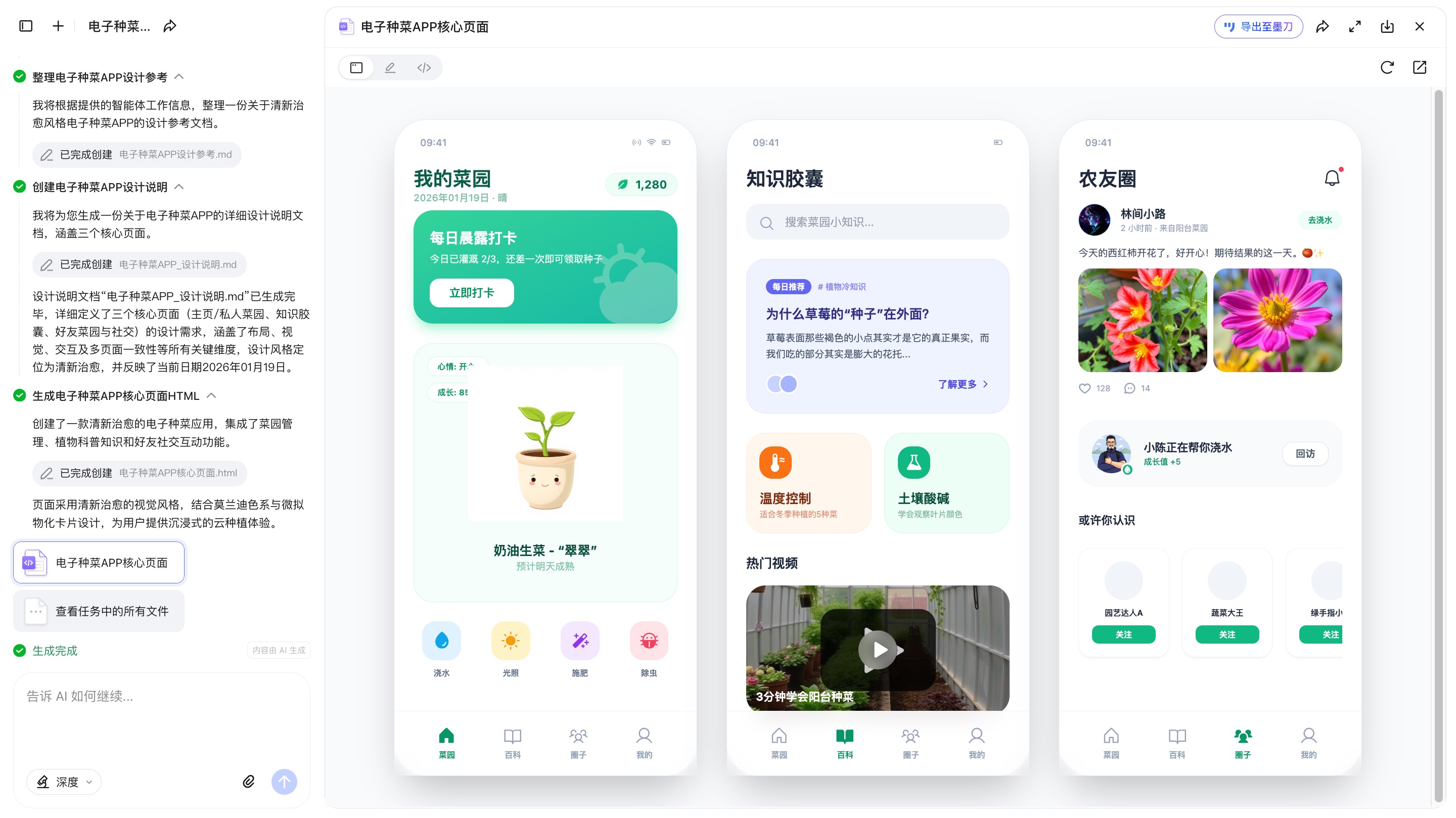 帮我设计一个电子种菜APP的3个核心页面,风格要清新治愈,解决很多年轻人向往的种菜生活。 核心功能很简单: