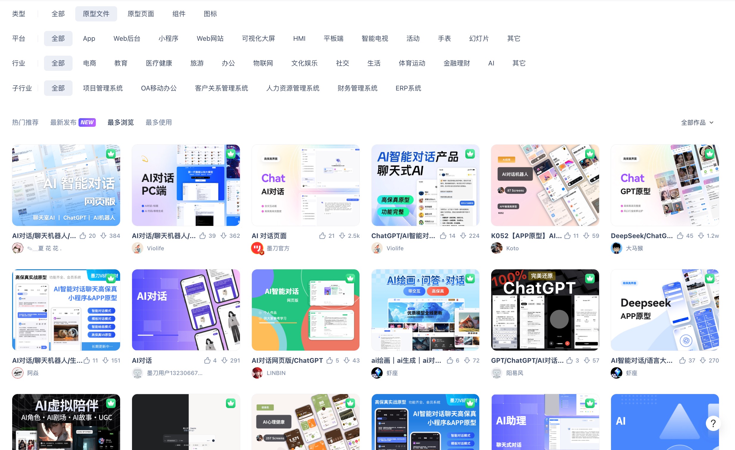 很多在线原型设计工具都有素材广场或者模板社区。这个方法其实并不是什么独门技巧,只是很多人容易忽略它的方便。比如我要做一个AI对话类APP,去素材广场里搜关键词,就能找到很多现成的原型模板。挑一个布局最接近的一键复用,然后再去修改一下细节,比如删除不需要的页面,调整文案和少量布局,也可能根据自己的业务补一两个关键页面。