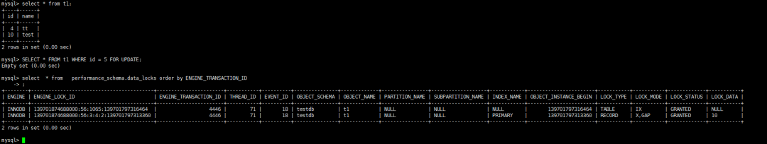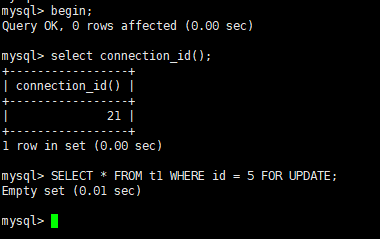 SELECT * FROM t1 WHERE id = 5 FOR UPDATE; -- 返回空