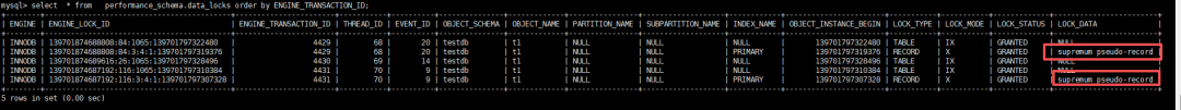 SELECT * FROM t1 WHERE id = 5 FOR UPDATE;由于没有真实记录,InnoDB 将查询定位到Supremum,并在其上加一个 X,GAP 锁。通过 performance_schema.data_locks 可看到: