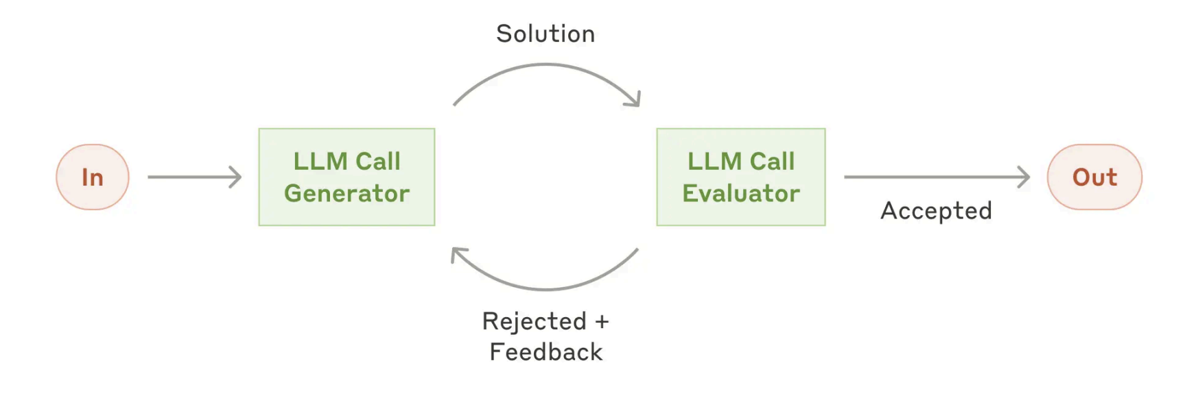 此种工作流中有生成者也有评价者。生成者产生方案,评价者对方案进行评估并给出反馈,如果符合要求就输出结果,如果不符合就直接拒绝并参考意见重新生成,形成 “生成 - 评估 - 优化” 闭环。