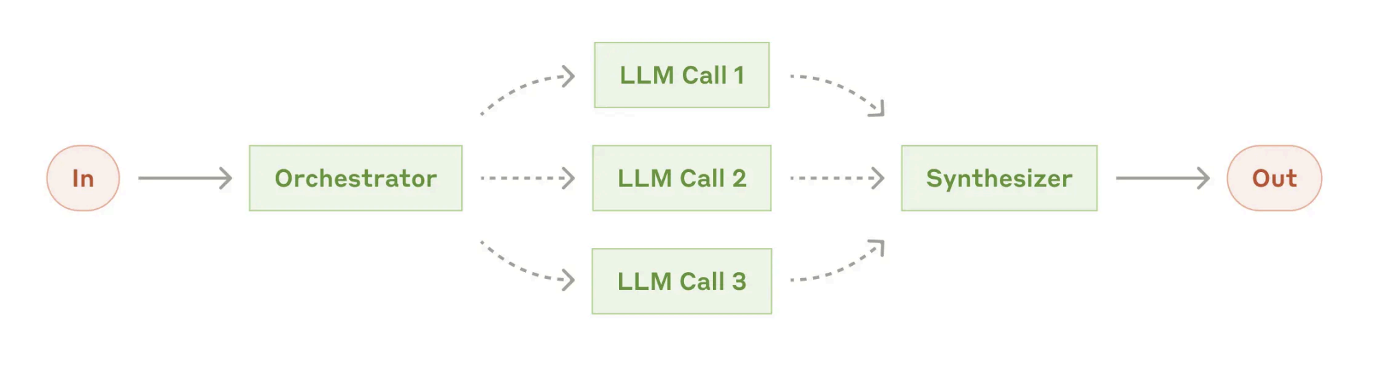 核心逻辑:在此种工作流中,有一个中心控制的LLM,动态的拆解任务并将其编排到特定的工作模型或工具中,最后进行结果的综合输出。