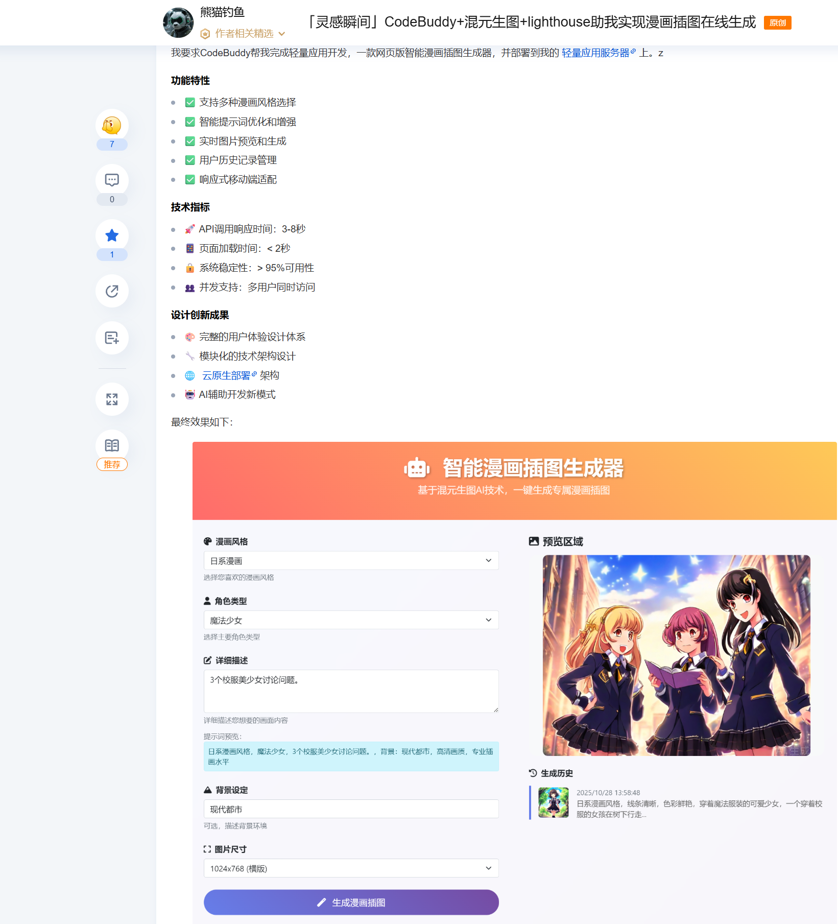 比如我的作品:「灵感瞬间」CodeBuddy+混元生图+lighthouse助我实现漫画插图在线生成
