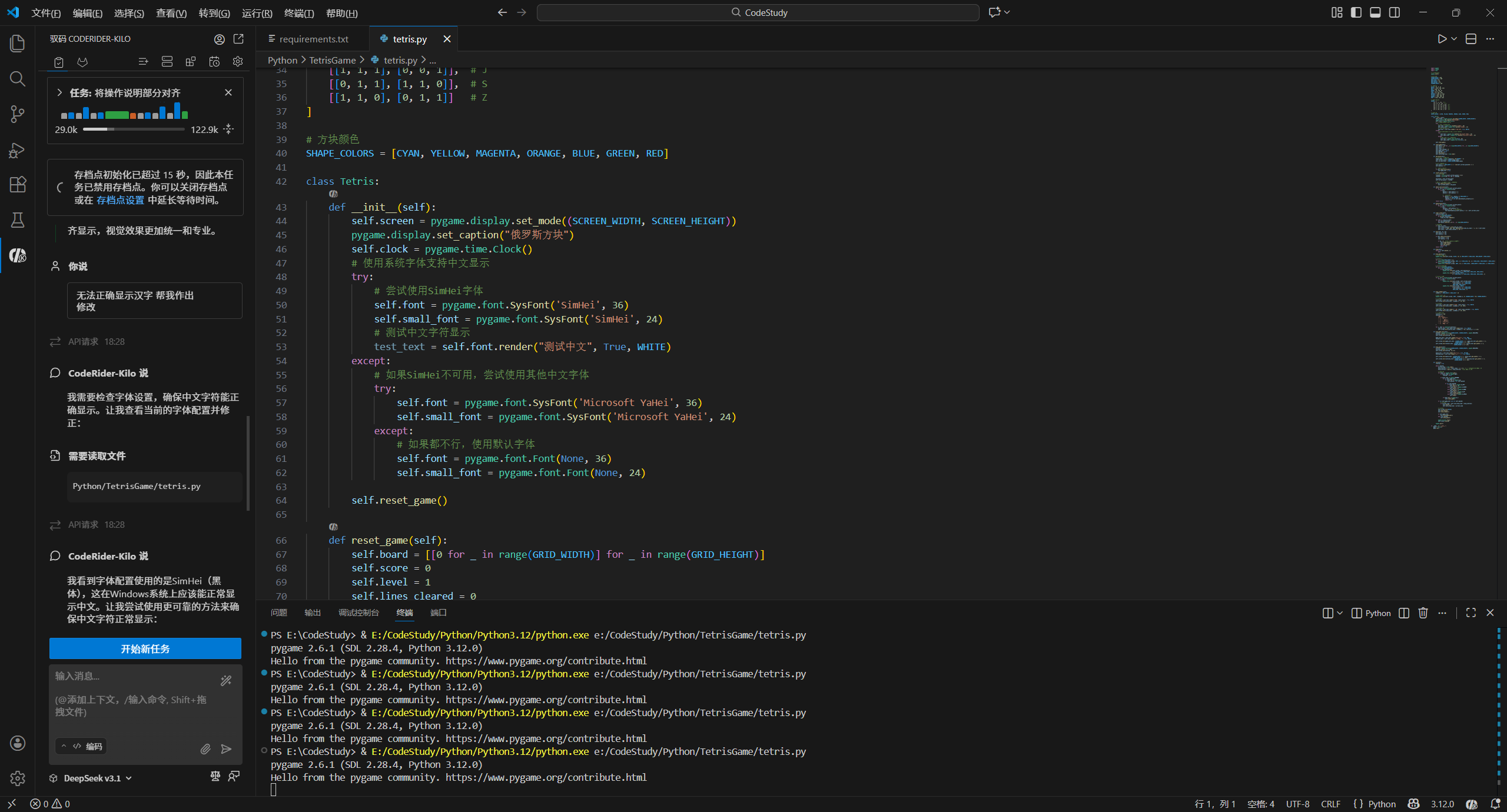 在CodeRider-Kilo AI助手的帮助下,我成功实现了一个功能完整的俄罗斯方块游戏。以下是AI助手在开发过程中的具体协助: