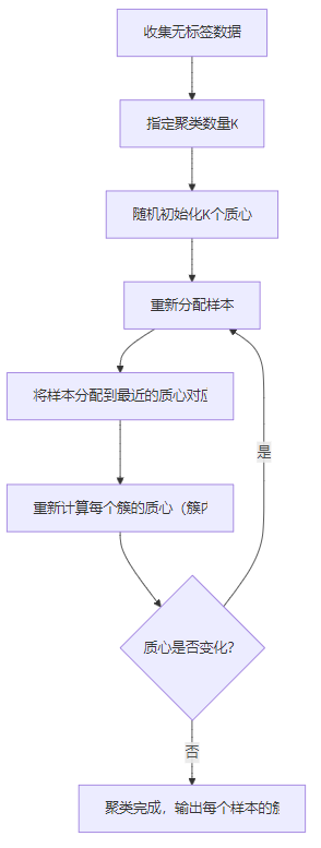print(f"K={k}时准确率:{acc:.2f}")n_neighbors(K值)是KNN的核心参数:K太小易过拟合,K太大易欠拟合,需根据数据调整;StandardScaler);K-均值聚类是最基础的无监督学习算法(数据无标签),核心逻辑是:将数据自动分成K个“簇”,使同一簇内的数据相似度高,不同簇间相似度低。它通过迭代调整簇中心(质心)实现聚类。 适用场景:用户分群(如电商用户画像)、图像分割、异常检测、数据降维。