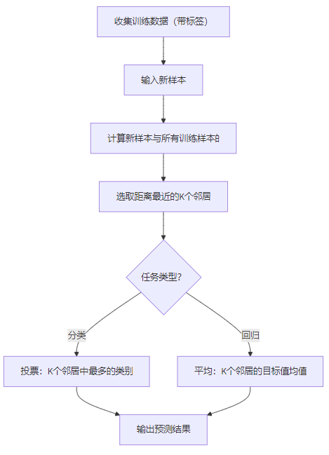 plt.show()StandardScaler);kernel参数:linear(线性核)适合线性可分数据,rbf(高斯核)适合非线性数据,是最常用的核函数;make_circles:生成环形非线性数据,能直观体现RBF核的作用。KNN是最简单的机器学习算法之一,核心逻辑是“近朱者赤,近墨者黑”:对于新样本,找到它在训练集中最接近的K个邻居,按邻居的类别(分类)或均值(回归)确定新样本的结果。 适用场景:简单分类(如手写数字识别)、推荐系统、异常检测。