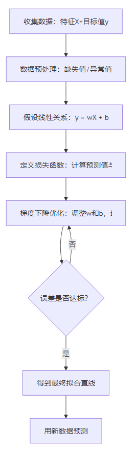 线性回归是机器学习中最基础的回归算法(用于预测连续数值),核心逻辑是:找到一条“最佳拟合直线”,用自变量(如房屋面积)预测因变量(如房价)。它假设特征与目标值之间存在线性关系(即
