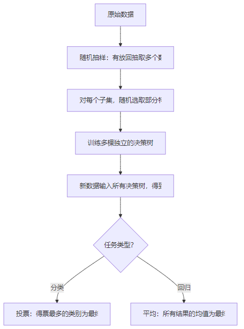随机森林是集成学习算法,核心是“多棵决策树投票”:随机选取部分特征和部分数据,训练多棵独立的决策树,最终通过投票(分类)或平均(回归)得到结果。它解决了单棵决策树“过拟合”的问题,稳定性更强。 适用场景:几乎所有分类/回归场景(如风控建模、图像分类、销量预测),是工业界最常用的算法之一。