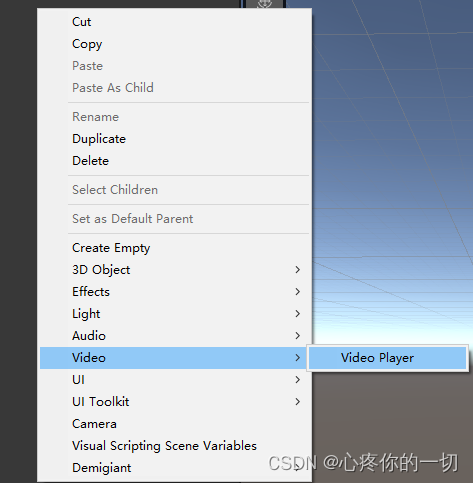 在Hierarchy面板右键创建VideoPlayer组件