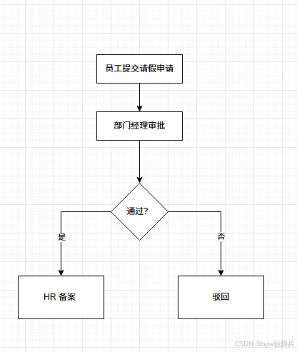 - 给 “部门经理审批” 的连接线加 “判断”:拖一个 “决策” 形状(菱形)放在 “部门经理审批” 下方,分别连 “通过→HR 备案” 和 “不通过→驳回”。