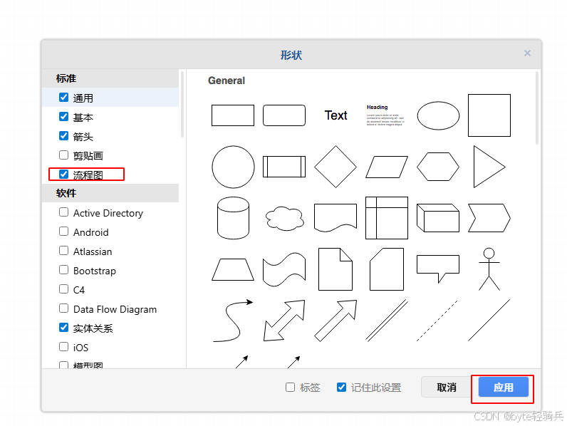 - 左侧工具栏点击 “更多形状”→勾选 “流程图”→点击 “应用”(加载流程图专用形状库,图 4:加载流程图形状库的操作截图);