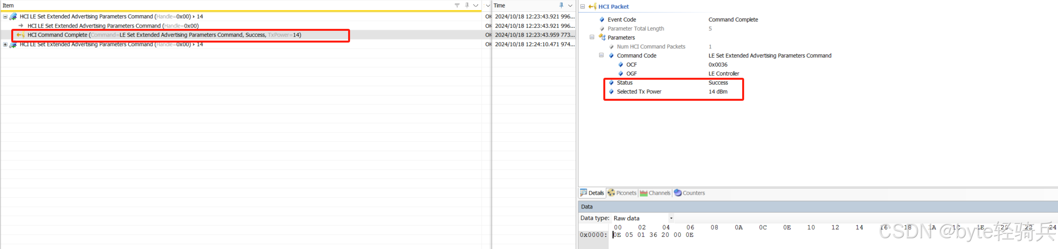 四、返回参数详解 4.1. Status 描述 :这是一个状态码,用于指示HCI_LE_Set_Extended_Advertising_Parameters命令是否成功执行。可能取值 : 0x00:成功。命令已成功执行,没有错误。0x0A:命令不允许(Command Disallowed) 。当前状态不允许执行该命令。0x11:不支持的功能(Unsupported Feature or Parameter Value) 。提供的参数值不被支持。0x12:无效的参数格式(Invalid HCI Command Parameters) 。命令参数格式不正确。其他状态码可能表示硬件故障、资源限制等问题。 作用 :通过检查状态码,主机可以确定命令是否成功执行,并据此采取适当的措施(如重试命令、调整参数值或报告错误)4.2. Selected_TxPower (在某些情况下)描述: Selected_TX_Power 是一个数值参数,用于指示BLE控制器在发送广播包时所使用的发射功率。该值通常以分贝毫瓦(dBm)为单位表示,是一个衡量发射器输出功率强弱的指标。可能取值 : 发射功率级别通常以dBm(分贝毫瓦)为单位表示。 可能的取值范围取决于设备的实现和蓝牙核心规范的版本。例如,某些设备可能支持从-20 dBm到+10 dBm的发射功率级别。 如果设备不支持返回Selected_TxPower参数,或者由于某种原因无法确定实际选择的发射功率级别,则可能不会返回此参数。 作用 :通过了解实际选择的发射功率级别,主机可以评估设备的广播范围,并据此调整其他参数(如广播间隔)以优化设备发现过程。4.3. 使用注意事项 在解析返回参数时,务必参考蓝牙核心规范和设备的实现文档,以确保正确理解和处理这些参数。 如果Status参数指示命令失败,请检查提供的参数值是否符合蓝牙核心规范的要求,并考虑可能的硬件限制或资源冲突。 如果设备支持Selected_TxPower参数,并且您希望了解实际选择的发射功率级别,请确保在发送HCI_LE_Set_Extended_Advertising_Parameters命令时包含了必要的参数,以便设备能够确定并返回该值。 五、命令执行流程 HCI_LE_Set_Extended_Advertising_Parameters 命令的执行流程通常涉及以下几个步骤,这些步骤确保了BLE设备能够正确配置并启动扩展广播功能。