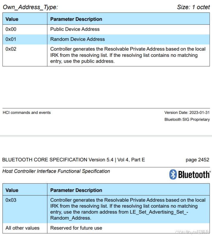 3.5.1. Own_Address_Type(自身地址类型) Own_Address_Type指定了BLE设备在广播或连接过程中使用的自身地址类型。BLE设备可以使用以下类型的地址: