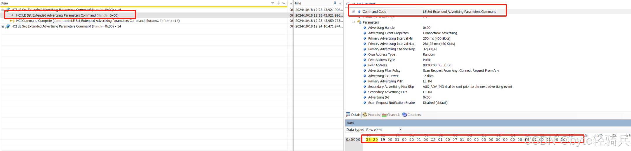 OpCode :操作码,用于标识该命令。该命令的操作码通常由蓝牙核心规范定义。参数长度 :表示后续参数的总长度(以字节为单位)。广播句柄 :一个唯一的标识符,用于区分设备上的不同广播集。广播参数 :包括广播类型、广播事件属性、主广播物理层选项、次广播物理层选项等多个参数。2.2. 示例参数结构 Opcode: 0x0026 (HCI_LE_Set_Extended_Advertising_Parameters)