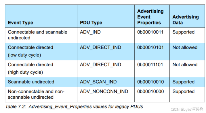 3.2.2. 传统广播PDU类型与参数值当使用传统广播PDU类型时,广播事件属性的参数值必须严格遵循BLE规范中表7.2的规定。