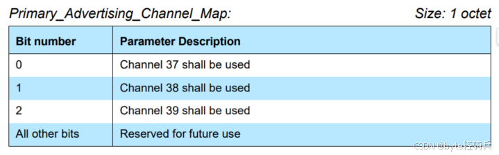 - Advertising_Channel_Map (1 octet): 广播通道映射,指示在哪些通道上发送广播。