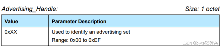 - Advertising_Handle (2 octets): 广播的句柄,用于标识广播集。通常,第一个广播集的句柄为0x0000。