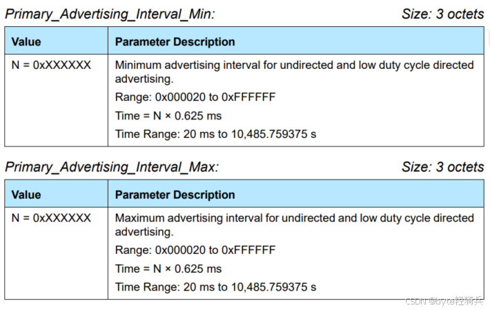 3.3. 广播间隔 (Primary_Advertising_Interval_Min 和 Primary_Advertising_Interval_Max) 广播间隔是BLE设备广播其存在和可用性时的重要参数。这些参数定义了设备广播的频率,即两次连续广播之间的时间间隔。