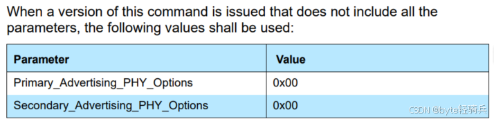 Primary_Advertising_PHY :这是一个配置参数,用于指定在主要广播物理信道上使用的PHY类型。主机(Host)通过此参数告诉控制器(Controller)应该使用哪种PHY来发送广播数据包。错误代码 :如果主机指定了一个控制器不支持的PHY类型(包括为未来使用保留的值),控制器应返回一个错误代码,通常是“Unsupported Feature or Parameter Value”(0x11),以指示该操作不被支持。4. 选项: