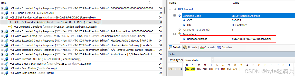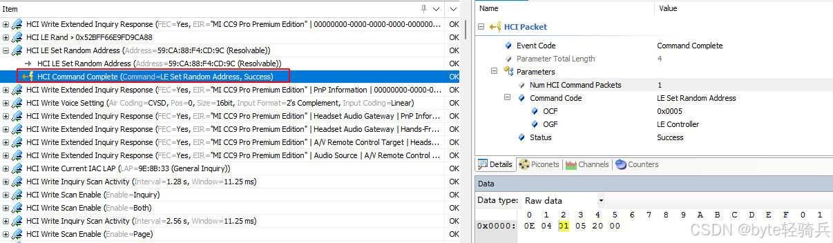 假设一个具体的HCI_LE_Set_Random_Address命令返回事件的二进制表示如下(以十六进制为例):