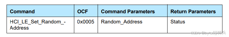 HCI_LE_Set_Random_Address命令用于由Host设置Control中的LE随机设备地址。此命令允许主机为设备指定一个新的随机地址,以便在通信过程中使用。
