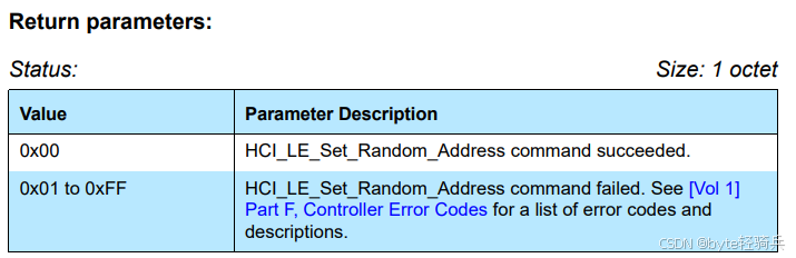 以下是一个HCI_LE_Set_Random_Address命令返回HCI Command Complete事件的示例格式: