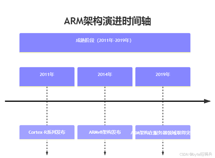 2011年 :Cortex-R系列发布,面向实时控制系统,提供高可靠性设计,满足汽车、航空航天等领域的需求。2014年 :ARMv8架构发布,支持64位处理,提升系统性能,为ARM架构进军服务器市场奠定基础。2019年 :ARM架构在服务器领域取得突破,多款基于ARM架构的服务器芯片发布,如阿里的自研服务器芯片等。④现代化发展(2020年至今)