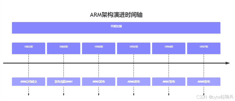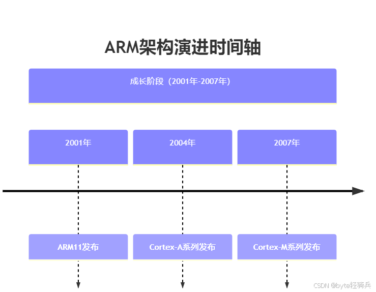 1983年 :ARM公司成立,开始研发RISC架构处理器。1985年 :发布首款ARM架构处理器——ARM1,奠定了低功耗、低成本的RISC架构基础。1990年 :ARM2发布,引入流水线技术,显著提高处理器性能。1992年 :ARM6发布,支持32位寻址,为现代ARM架构奠定基础。1994年 :ARM7发布,广泛应用于嵌入式系统,成为经典处理器系列。1997年 :ARM9发布,性能进一步提升,支持更多外设接口,成为早期智能手机和PDA的核心处理器。②成长阶段(2001年-2007年)