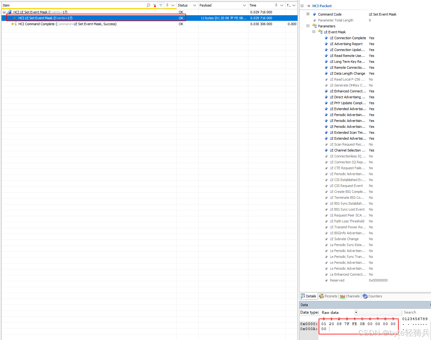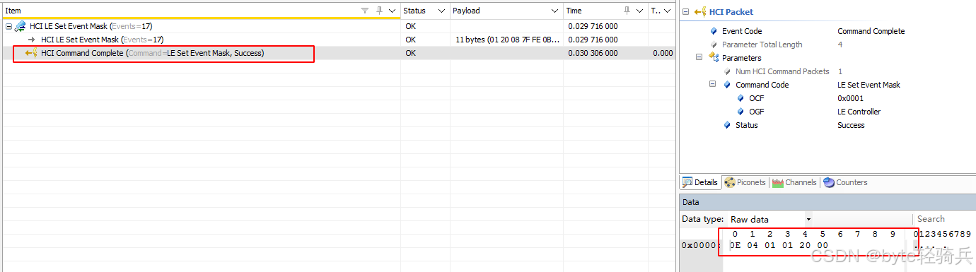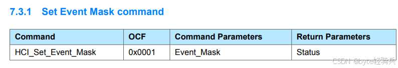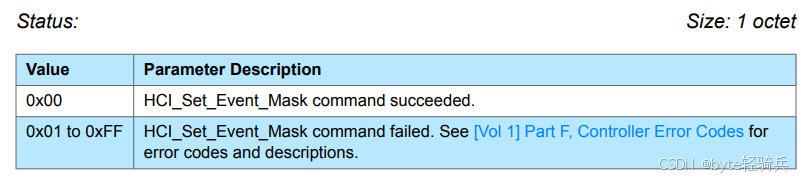 HCI_Set_Event_Mask 命令的返回参数中包含 Status,其大小为 1 个八位字节(octet),也就是 1 字节,通过这个字节的值来反馈命令执行的结果情况。