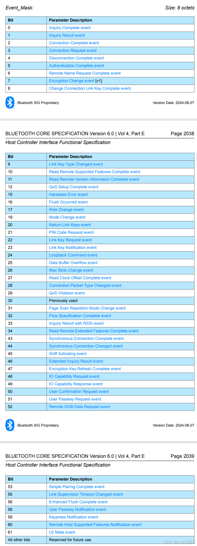 Event_Mask 的大小为 8 个八位字节(octets),也就是 64 位。每一位都对应着一种特定的蓝牙事件,通过将相应位设置为 0 或 1,主机可以控制是否接收对应的蓝牙事件,以此来定制符合自身需求的事件通知机制。
