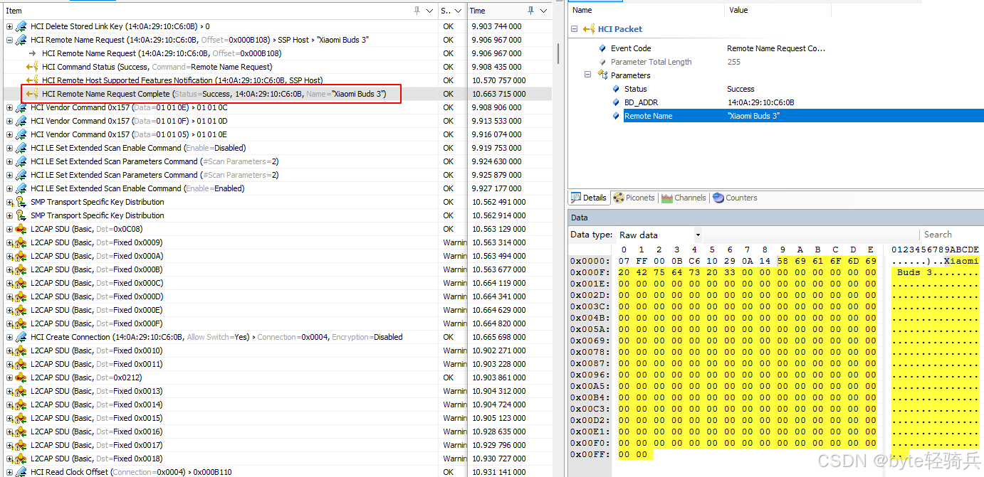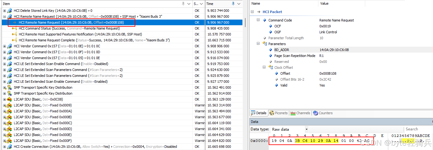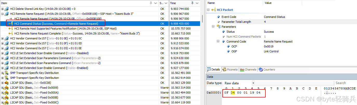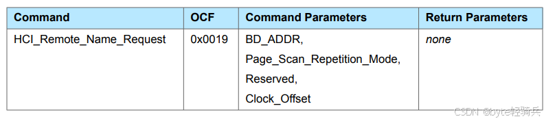 0x0419: 表示HCI_Remote_Name_Request command(操作码),其中OGF=0x01(0000 01),OCF=0x0019(00 0001 1001)