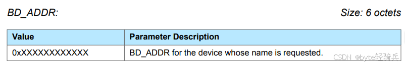 在蓝牙通信协议中,BD_ADDR(Bluetooth Device Address)是一个至关重要的参数,它用于唯一标识每一个蓝牙设备。这个地址由6个八位字节(octets)组成,总共48位,通常展现为16进制数字串,格式类似于0xXXXXXXXXXXXX(这里的X代表十六进制数字0-9以及字母A-F)。
