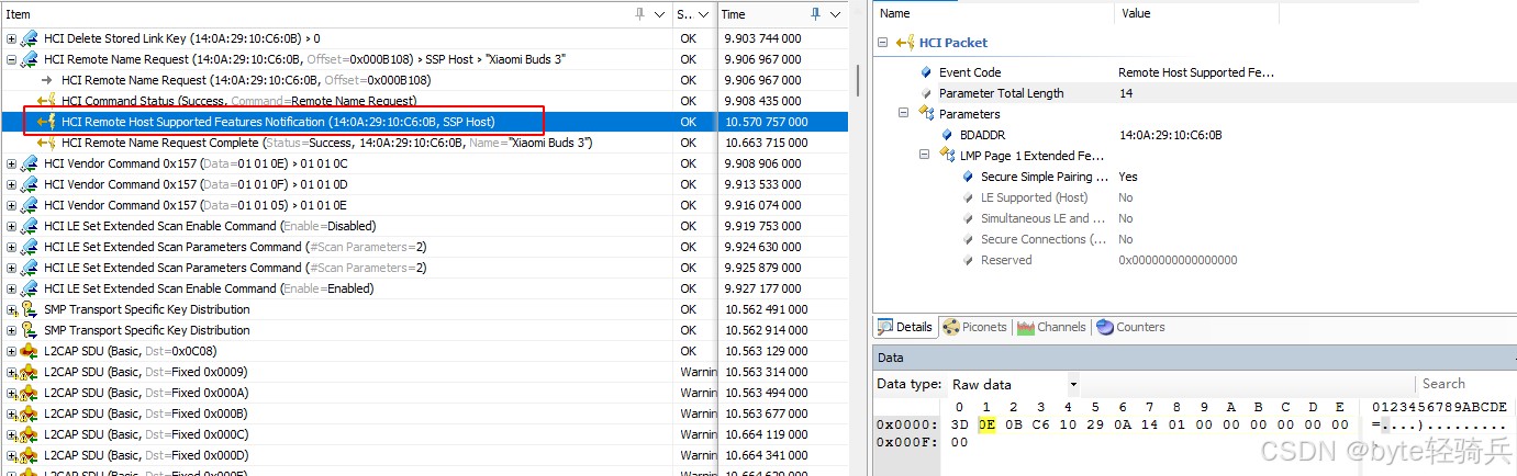 0xf094: 表示Clock_Offset(时钟偏移量),其中bit 15为1表示时钟偏移有效,bit 0-14为0x7094(28820)在这个示例中,命令包以0x01开头,表示这是一个HCI命令包。紧接着是操作码0x0419,指示这是一个HCI_Remote_Name_Request命令。参数总长度为10个字节,包括远端设备地址、页面扫描重复模式、保留字段和时钟偏移量等参数。