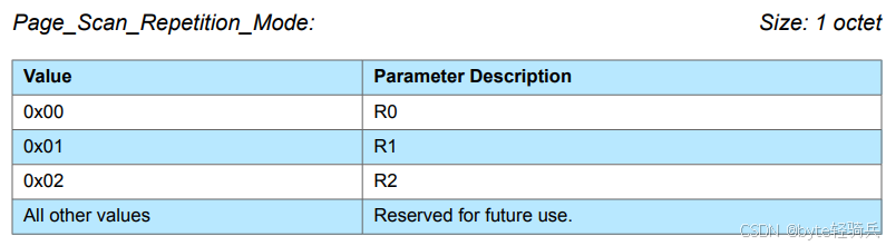 Page_Scan_Repetition_Mode是蓝牙通信协议中的一个参数,它指定了远端设备在进行page扫描时的重复模式。这个参数的大小为1个八位字节(octet),其取值范围及对应的描述如下: