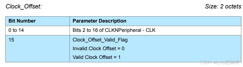 “Clock_Offset”字段在蓝牙通信中起着至关重要的作用,它用于表示从设备的本地时钟与主设备或参考时钟之间的偏移量,并包含一个有效标志来指示该偏移量是否有效。在使用时,需要特别注意其值的计算和更新,以确保蓝牙通信的稳定性和可靠性。