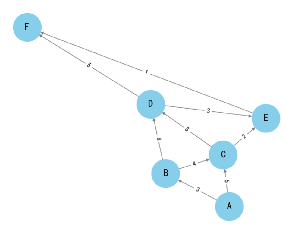 edges = [('A', 'B', 3), ('A', 'C', 6), ('B', 'C', 4), ('B', 'D', 4), ('C', 'D', 8), ('C', 'E', 2), ('D', 'E', 3), ('D', 'F', 5), ('E', 'F', 1)]