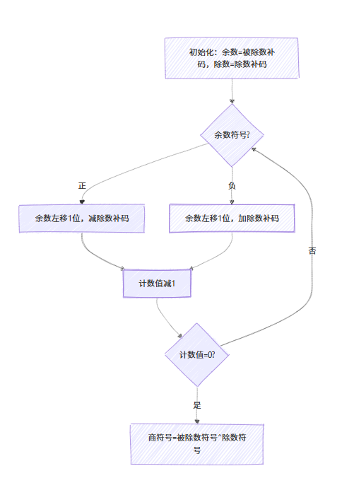 }补码不恢复余数法:根据余数符号决定加减除数。 流程图: