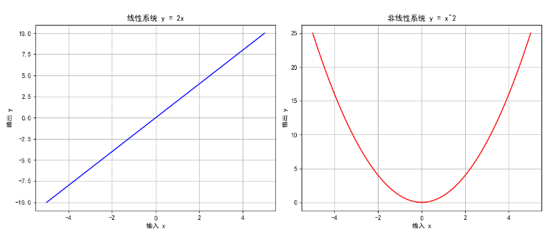 控制系统可以分为线性系统和非线性系统。线性系统满足叠加原理,而非线性系统则不满足。下面通过一个简单的例子来说明两者的区别: