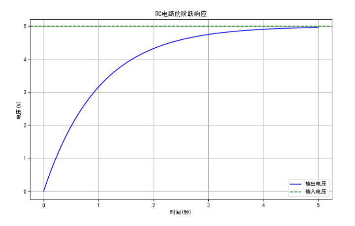 上述代码模拟了 RC 电路在阶跃输入电压作用下的响应。通过求解一阶微分方程,得到了电容电压随时间的变化曲线。从结果可以看出,电容电压会逐渐上升到输入电压值,上升的速度取决于时间常数 RC。