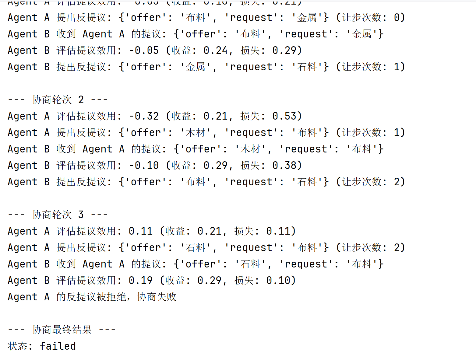 print(f"Agent {self.agent_id} 的反提议被拒绝,协商失败")