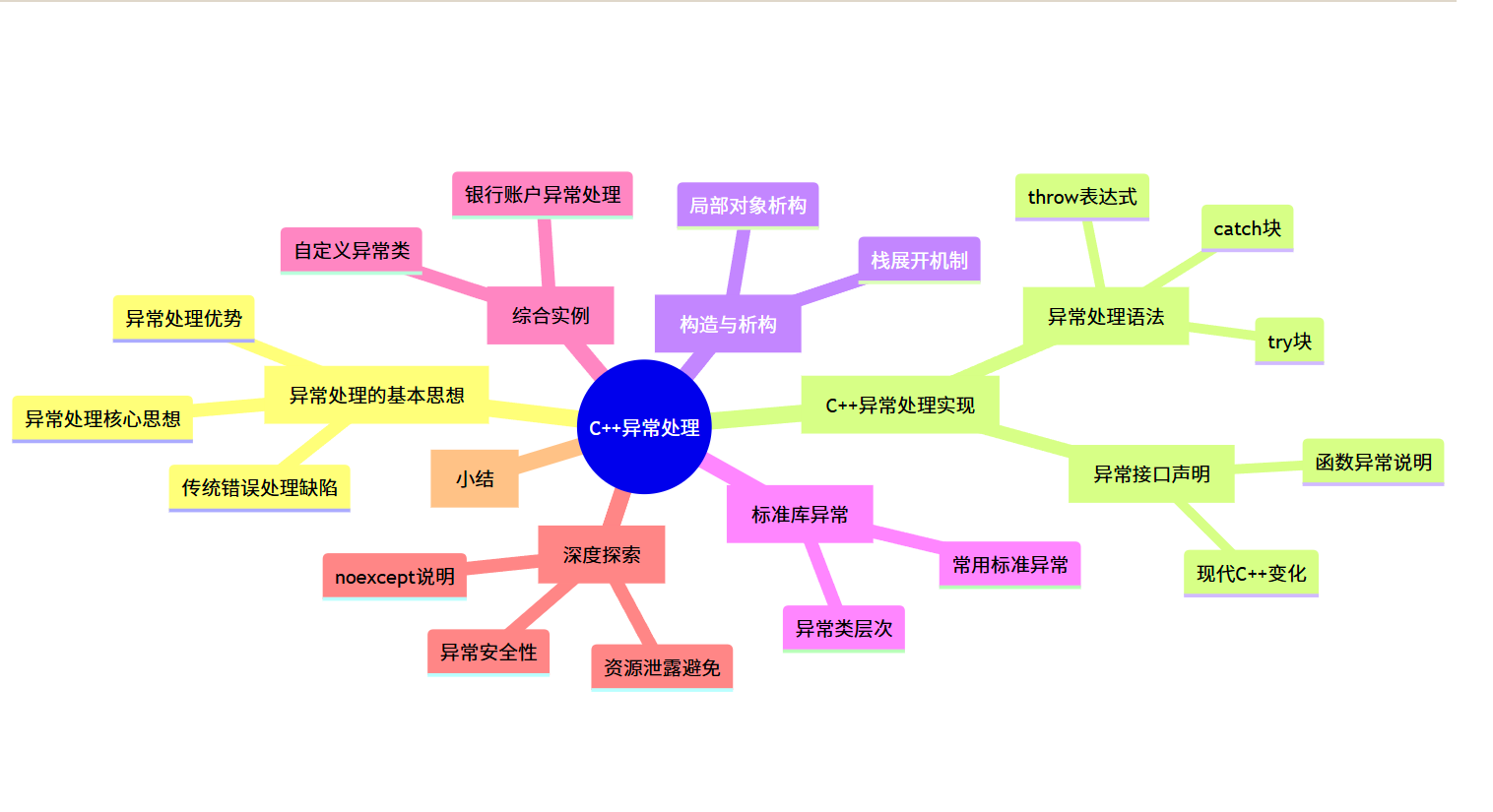 noexcept,不应抛出异常noexceptnoexcept本章我们系统学习了 C++ 异常处理机制,核心要点总结: