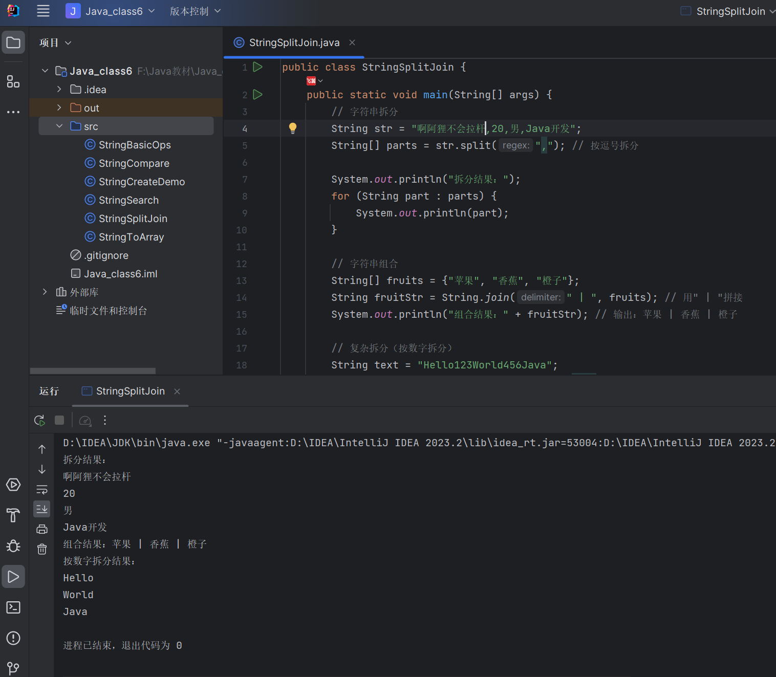 split(String regex) 按正则表达式拆分字符串为数组String.join(CharSequence delimiter, CharSequence... elements) 按分隔符拼接数组代码示例: