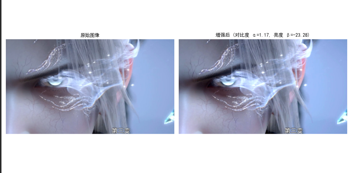 plt.title(f"增强后 (对比度 α={alpha:.2f}, 亮度 β={beta:.2f})")