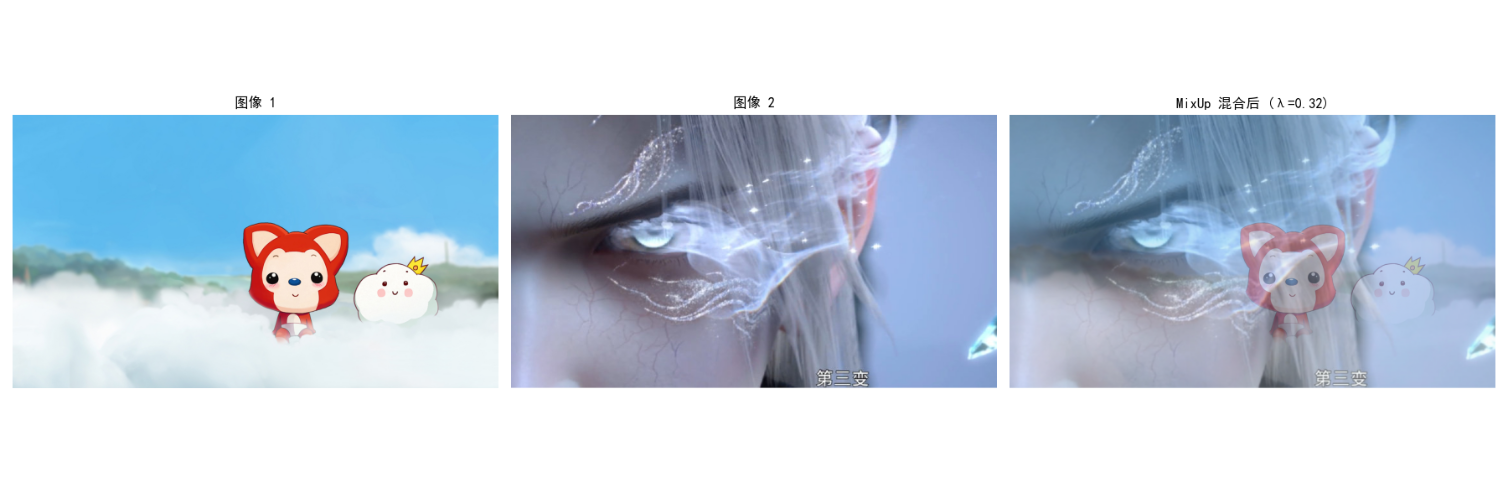 将两张图像按比例(如 α=0.3)混合(像素值:img = α*img1 + (1-α)*img2),标签也按同比例混合,提升模型对样本变化的适应力。