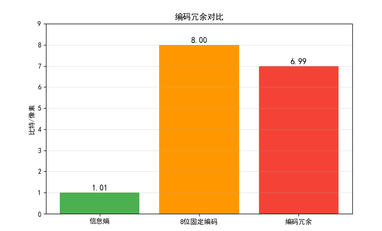 效果对比图位置:运行上述代码后,会生成 “编码冗余对比” 柱状图,直观看到 8 位固定编码的冗余量。