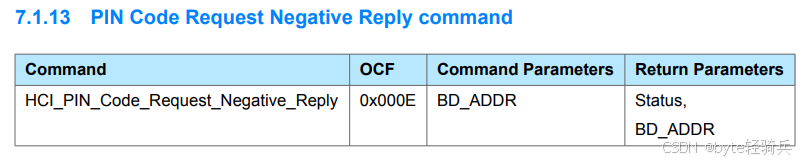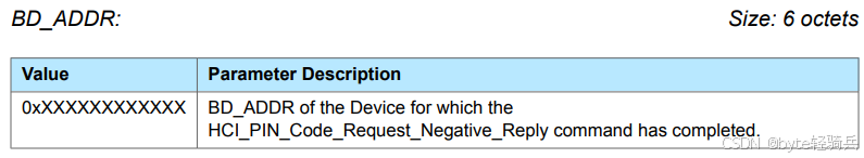 0x00:表示HCI_PIN_Code_Request_Negative_Reply命令成功执行。0x01至0xFF:表示命令执行失败。具体的错误码和描述可以在蓝牙核心规范的第1卷的第F部分找到。蓝牙Controller错误代码全面概览_connection rejected due to limited resources-CSDN博客BD_ADDR用于明确是哪个设备对应的 HCI_PIN_Code_Request_Negative_Reply 命令已经完成。