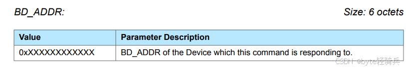 BD_ADDR 代表着蓝牙设备地址(Bluetooth Device Address),它是一个在全球范围内唯一标识每个蓝牙设备的标识符,类似于网络通信中设备的 MAC 地址。在复杂的蓝牙网络环境或者多设备同时存在的场景中,通过 BD_ADDR 能清晰地界定命令的目标设备,避免出现误操作或者回复到错误设备的情况,保证整个命令执行的准确性和针对性。蓝牙MAC地址-CSDN博客