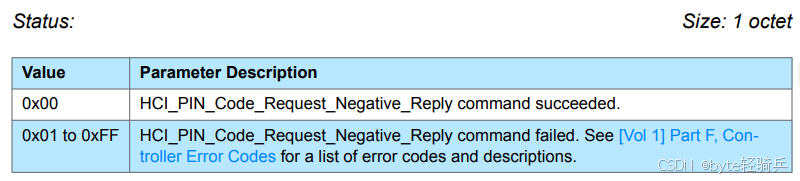 HCI_PIN_Code_Request_Negative_Reply来说,通常不会有额外的参数)。Status用于指示 HCI_PIN_Code_Request_Negative_Reply 命令是否成功执行。大小为 1 个八位组(octet),即 1 字节。